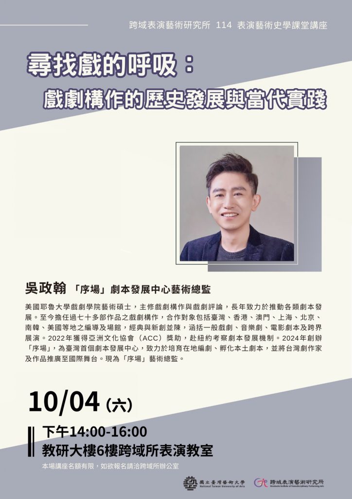 9 月 27 表演藝術史學課堂講座:吳政翰老師「尋找戲的呼吸:戲劇構作的歷史發展與當代實踐」 發布時間: 17:30 分類: 學術講座, 系所公告 本活動為跨域所辦理表演藝術史學課堂講座邀請「序場」劇本發展中心藝術總監吳政翰老師主講,歡迎對戲劇構作的歷史與當代發展有興趣的朋友踴躍參加。講者簡介:吳政翰老師為美國耶魯大學戲劇學院藝術碩士,主修戲劇構作與戲劇評論,長年致力於推動各類劇本發展。至今擔任過七十多部作品之戲劇構作,合作對象包括臺灣、香港、澳門、上海、北京、南韓、美國等地之編導及場館,經典與新創並陳,涵括一般戲劇、音樂劇、電影劇本及跨界展演。2022年獲得亞洲文化協會(ACC)獎助,赴紐約考察劇本發展機制。2024年創辦「序場」,為臺灣首個劇本發展中心,致力於培育在地編劇、孵化本土劇本,並將台灣劇作家及作品推廣至國際舞台。現為「序場」藝術總監。講座資訊如下:1.時間:2025年10月4日(六)14:00~16:002.地點:國立臺灣藝術大學 教學研究大樓六樓 跨域表演藝術研究所表演教室3.本場講座名額有限,如欲報名請洽跨域所辦公室。4.本活動校內學生可免費參與,校外人士酌收50元(本所校友8折優惠)場地清潔費(款項將捐入臺藝大跨域表演藝術研究所,開立收據)。5.若因疫情或其他不可抗力之因素造成本活動未能如期舉辦,將以國立臺灣藝術大學跨域表演藝術研究所官方網站( https://tpa.ntua.edu.tw/ )之公告為準。