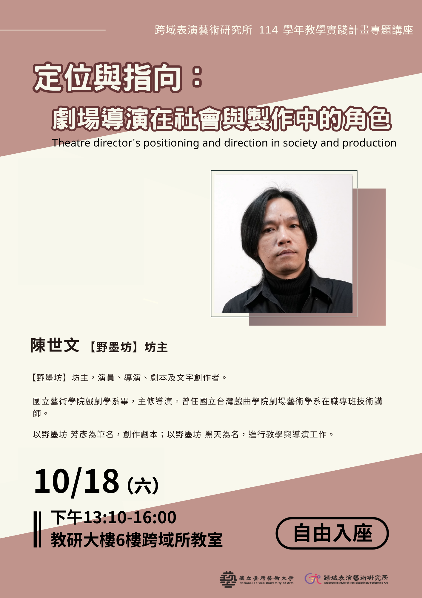 本活動為跨域所辦理114學年教學實踐研究計畫專題講座(計畫主持人:沈惠如副教授)邀請【野墨坊】坊主,演員、導演、劇本及文字創作者陳世文老師主講,歡迎對劇場導演相關議題有興趣的朋友踴躍參加。講者簡介:陳世文老師為【野墨坊】坊主,演員、導演、劇本及文字創作者。國立藝術學院戲劇學系畢,主修導演。曾任國立臺灣戲曲學院劇場藝術學系在職專班技術講師。以野墨坊 芳彥為筆名,創作劇本;以野墨坊 黑天為名,進行教學與導演工作。講座資訊如下:1.時間:2025年10月18日(六)13:10~16:002.地點:國立臺灣藝術大學 教學研究大樓六樓 跨域表演藝術研究所3.本活動自由入座,免報名。4.本活動校內學生可免費參與,校外人士酌收50元(本所校友8折優惠)場地清潔費(款項將捐入臺藝大跨域表演藝術研究所,開立收據)。5.若因疫情或其他不可抗力之因素造成本活動未能如期舉辦,將以國立臺灣藝術大學跨域表演藝術研究所官方網站( https://tpa.ntua.edu.tw/ )之公告為準。