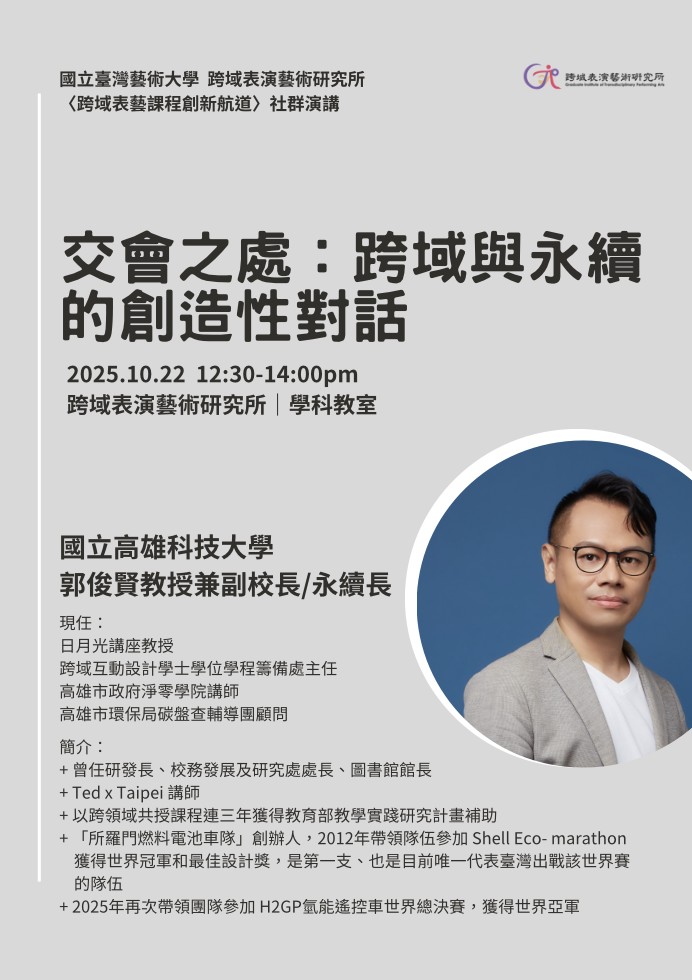 10 月 15 跨域表藝課程創新航道社群講座:郭俊賢教授「交會之處:跨域與永續的創造性對話」 發布時間: 16:36 分類: 學術講座, 系所公告 本活動為跨域所辦理114-1學期教師專業社群「跨域表藝課程創新航道」專題講座(計畫主持人:陳慧珊教授),非常榮幸邀請到國立高雄科技大學副校長/永續長郭俊賢教授主講,歡迎對當代最「夯」的二大議題:跨域與永續有興趣的朋友踴躍參加。郭俊賢教授現任:國立高雄科技大學副校長/研發長日月光講座教授跨域互動設計學士學位學程籌備處主任高雄市政府淨零學院講師高雄市環保局碳盤查輔導團顧問簡介:曾任研發長、校務發展及研究處處長、圖書館館長Ted x Taipei 講師以跨領域共授課程連三年獲得教育部教學實踐研究計畫補助「所羅門燃料電池車隊」創辦人,2012年帶領隊伍參加Shell Eco-marathon獲得世界冠軍和最佳設計獎,是第一支、也是目前唯一代表臺灣出戰該世界賽的隊伍2025年再次帶領團隊參加H2GP氫能遙控車世界總決賽,獲得世界亞軍講座資訊如下:1.時間:2025年10月22日(三)12:30~14:002.地點:國立臺灣藝術大學 教學研究大樓六樓 跨域表演藝術研究所3.本活動自由入座,免報名。4.本活動校內學生可免費參與,校外人士酌收50元(本所校友8折優惠)場地清潔費(款項將捐入臺藝大跨域表演藝術研究所,開立收據)。5.若因疫情或其他不可抗力之因素造成本活動未能如期舉辦,將以國立臺灣藝術大學跨域表演藝術研究所官方網站( https://tpa.ntua.edu.tw/ )之公告為準。
