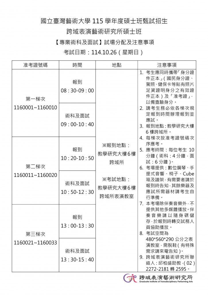 10 月 23 115學年度跨域所碩士班甄試招生試場分配及注意事項公告 發布時間: 11:34 分類: 系所公告 一、考試日期:114年10月26日(星期日) 08:30開始報到二、報到地點:教學研究大樓六樓 跨域表演藝術研究所三、考試當天考生應同時攜帶准考證、身分證件正本(國民身分證、駕照、健保卡等貼有照片足資證明身分之有效證件正本)應考,以便查驗身分。四、公告連結: https://aca.ntua.edu.tw/article.aspx?ca=98&id=2240 跨域所預祝各位考生考試順利、金榜題名!