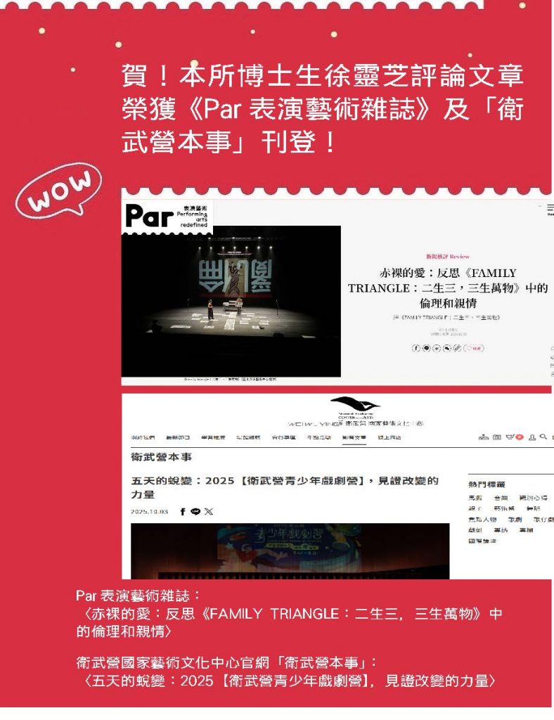 10 月 24 賀!本所博士生徐靈芝評論文章榮獲《Par表演藝術雜誌》及「衛武營本事」刊登! 發布時間: 15:46 分類: 榮譽榜, 系所公告 評論文章Par表演藝術雜誌:〈赤裸的愛:反思《FAMILY TRIANGLE:二生三,三生萬物》中的倫理和親情〉https://par.npac-ntch.org/tw/article/doc/HB8H2H5JB0衛武營國家藝術文化中心官網「衛武營本事」:〈五天的蛻變:2025【衛武營青少年戲劇營】,見證改變的力量〉https://www.npac-weiwuying.org/blogs/68df8f46a5a3d40008518a45
