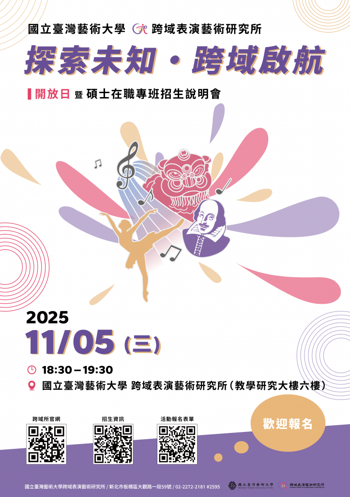 藝術的世界寬廣無限,讓跨域所打開您啟航的開關,探索未知的旅程!歡迎對表演藝術充滿熱情的朋友參加,讓跨域所開啟您藝術人生的嶄新篇章!
