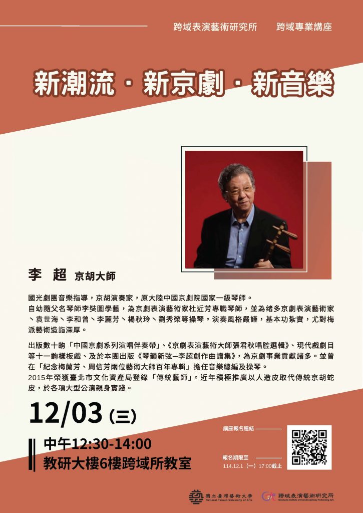 11 月 18 跨域專業講座:李超老師「新潮流·新京劇·新音樂」 發布時間: 17:17 分類: 學術講座, 系所公告 本活動為跨域所辦理跨域專業講座「新潮流·新京劇·新音樂」,非常榮幸邀請到著名京胡演奏家李超老師主講,戲曲音樂以及戲曲之現代演變有興趣的朋友踴躍參加。講者簡介:國光音樂指導,京胡演奏家,原大陸中國京劇院國家一級琴師。自幼隨父名琴師李奘圖學藝,為京劇表演藝術家杜近芳專職琴師,並為绪多京劇表演藝術家丶袁世海丶李和曾丶李麗芳丶楊秋玲丶劉秀榮等操琴。演奏風格嚴謹,基本功紮實,尤對梅派藝術造詣深厚。出版數十齣「中國京劇系列演唱伴奏帶」、《京劇表演藝術大師張君秋唱腔選輯》、現代戲劇目等十一齣樣板戲、及於本團出版《琴韻新弦─李超創作曲譜集》,為京劇事業貢獻諸多。並曾在「紀念梅蘭芳、周信芳兩位藝術大師百年專輯」擔任音樂總編及操琴。2015年榮獲臺北市文化資產局登錄「傳統藝師」。近年積極推廣以人造皮取代傳統京胡蛇皮,於各項大型公演親身實踐。講座資訊如下:1.時間:2025年12月3日(三)12:30~14:002.地點:國立臺灣藝術大學 教學研究大樓六樓 跨域表演藝術研究所3.本活動採取實聯制方式登記,因活動場地之限制開放人數有限,將以(1)本所學生(2)本校學生(3)校外人士 報名之優先順序錄取現場觀眾,錄取後以email進行通知,未錄取者則不另行通知。4.本活動報名時間至12/1(一)17:00截止。5.本活動校內學生可免費參與,校外人士酌收50元(本所校友8折優惠)場地清潔費(款項將捐入臺藝大跨域表演藝術研究所,開立收據)。6.若因不可抗力之因素造成本活動未能如期舉辦,將以國立臺灣藝術大學跨域表演藝術研究所官方網站( https://tpa.ntua.edu.tw/ )之公告為準。報名連結:https://forms.gle/3MGDq9T57VKtG74t9
