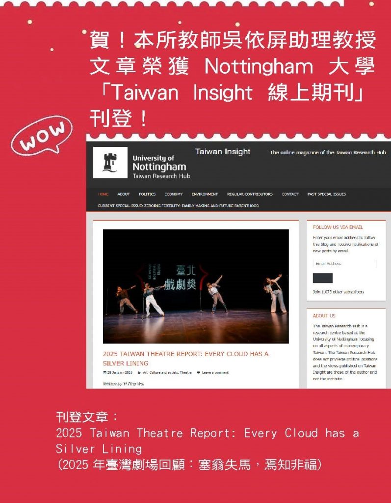 2 月 11 賀!本所教師吳依屏助理教授文章榮獲Nottingham大學「Taiwan Insight 線上期刊」刊登! 發布時間: 13:37 分類: 榮譽榜, 系所公告 刊登文章:2025 Taiwan Theatre Report: Every Cloud has a Silver Lining(2025年臺灣劇場回顧:塞翁失馬,焉知非福)網址連結:https://taiwaninsight.org/2026/01/28/2025-taiwan-theatre-report-every-cloud-has-a-silver-lining/