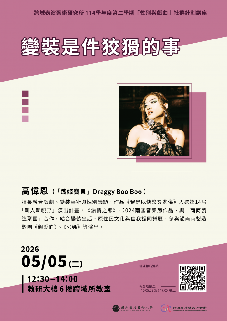 4 月 25 「性別與戲曲」社群講座:高偉恩「變裝是件狡猾的事」 發布時間: 15:08 分類: 學術講座, 系所公告 本活動為跨域所辦理「性別與戲曲」教師社群計畫講座「變裝是件狡猾的事」,非常榮幸邀請到劇場工作者跩姬寶貝(Draggy Boo Boo)高偉恩主講,歡迎對變裝藝術與性別議題有興趣的朋友踴躍參加。講者簡介:高偉恩(「跩姬寶貝」Draggy Boo Boo)擅長融合戲劇、變裝藝術與性別議題,作品《我是既快樂又悲傷》入選第 14 屆「新人新視野」演出計畫。《煽情之嘟》,2024 南國音樂節作品,與「両両製造聚團」合作,結合變裝皇后、原住民文化與自我認同議題。參與両両製造聚團《親愛的》、《公媽》等演出。 講座資訊如下:1.時間:2026年5月5日(二)13:10~16:002.地點:國立臺灣藝術大學 教學研究大樓六樓 跨域表演藝術研究所3.本活動採取實聯制方式登記,因活動場地之限制開放人數有限,將以(1)本所學生(2)本校學生(3)校外人士 報名之優先順序錄取現場觀眾,錄取後以email進行通知,未錄取者則不另行通知。4.本活動報名時間至5/3(日)17:00截止。5.本活動校內學生可免費參與,校外人士酌收50元(本所校友8折優惠)場地清潔費(款項將捐入臺藝大跨域表演藝術研究所,開立收據)。6.若因不可抗力之因素造成本活動未能如期舉辦,將以國立臺灣藝術大學跨域表演藝術研究所官方網站( https://tpa.ntua.edu.tw/ )之公告為準。報名連結:https://forms.gle/wzgpCAKSSWNMoRcYA