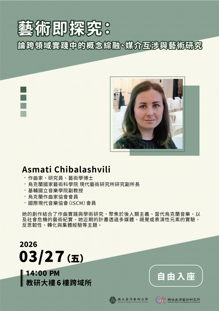 26 3 月 跨域學術講座:「藝術即探究:論跨領域實踐中的概念綜融、媒介互涉與藝術研究」Art as Inquiry: Conceptual Synthesis, Intermediality, and Artistic Research in Transdisciplinary Practice 當代世界動盪不安的時刻,藝術不只是表達,更是一種深層的探問與回應。本活動為跨域所辦理跨域學術講座「藝術即探究:論跨領域實踐中的概念綜融、媒介互涉與藝術研究 」,... <閱讀全文> ...