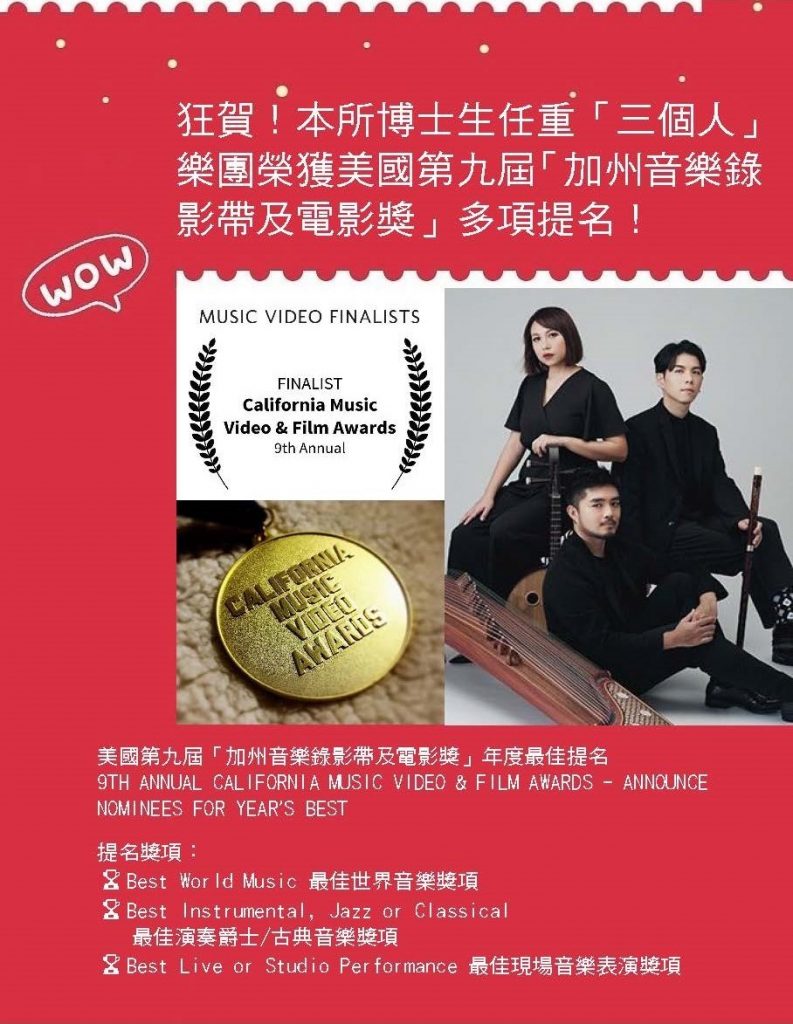09 1 月 狂賀!本所博士生任重「三個人」樂團榮獲美國第九屆「加州音樂錄影帶及電影獎」多項提名! 9TH ANNUAL CALIFORNIA MUSIC VIDEO & FILM AWARDS - ANNOUNCE NOMINEES FOR YEAR... <閱讀全文> ...