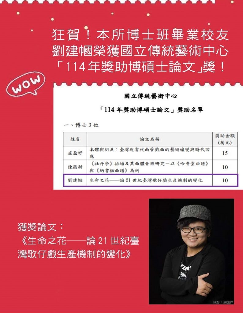 09 1 月 狂賀!本所博士班畢業校友 劉建幗榮獲國立傳統藝術中心「114年獎助博碩士論文」獎! 獲獎論文:《生命之花──論21世紀臺灣歌仔戲生產機制的變化》 網址連結:https://www.ncfta.gov.tw/News_Content.aspx?n... <閱讀全文> ...