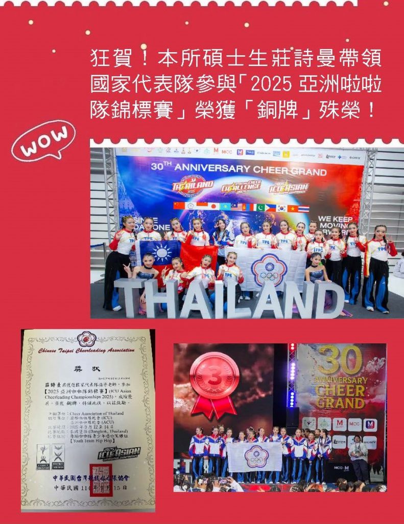 09 1 月 狂賀!本所碩士生莊詩曼帶領國家代表隊赴泰國參與「2025亞洲啦啦隊錦標賽」榮獲「銅牌」殊榮! 獲獎組別:Youth青少年嘻哈團體組(銅牌) 網址連結:https://www.facebook.com/share/p/1Ao8inBC3z/