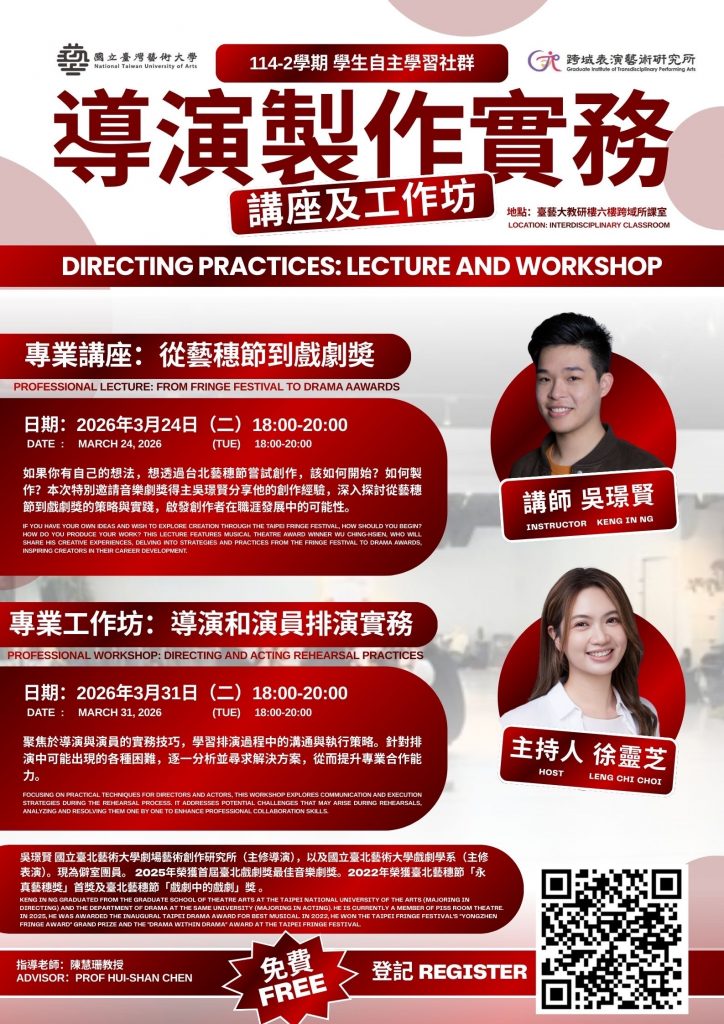 19 3 月 114-2學生自主學習社群:「導演製作實務」講座及工作坊 活動資訊:114-2學期 學生自主學習社群-導演製作實務一、專業講座:從藝穗節到戲劇獎日期:2026 年 3 月 24 日(二)18:00-20:00地點:臺藝... <閱讀全文> ...